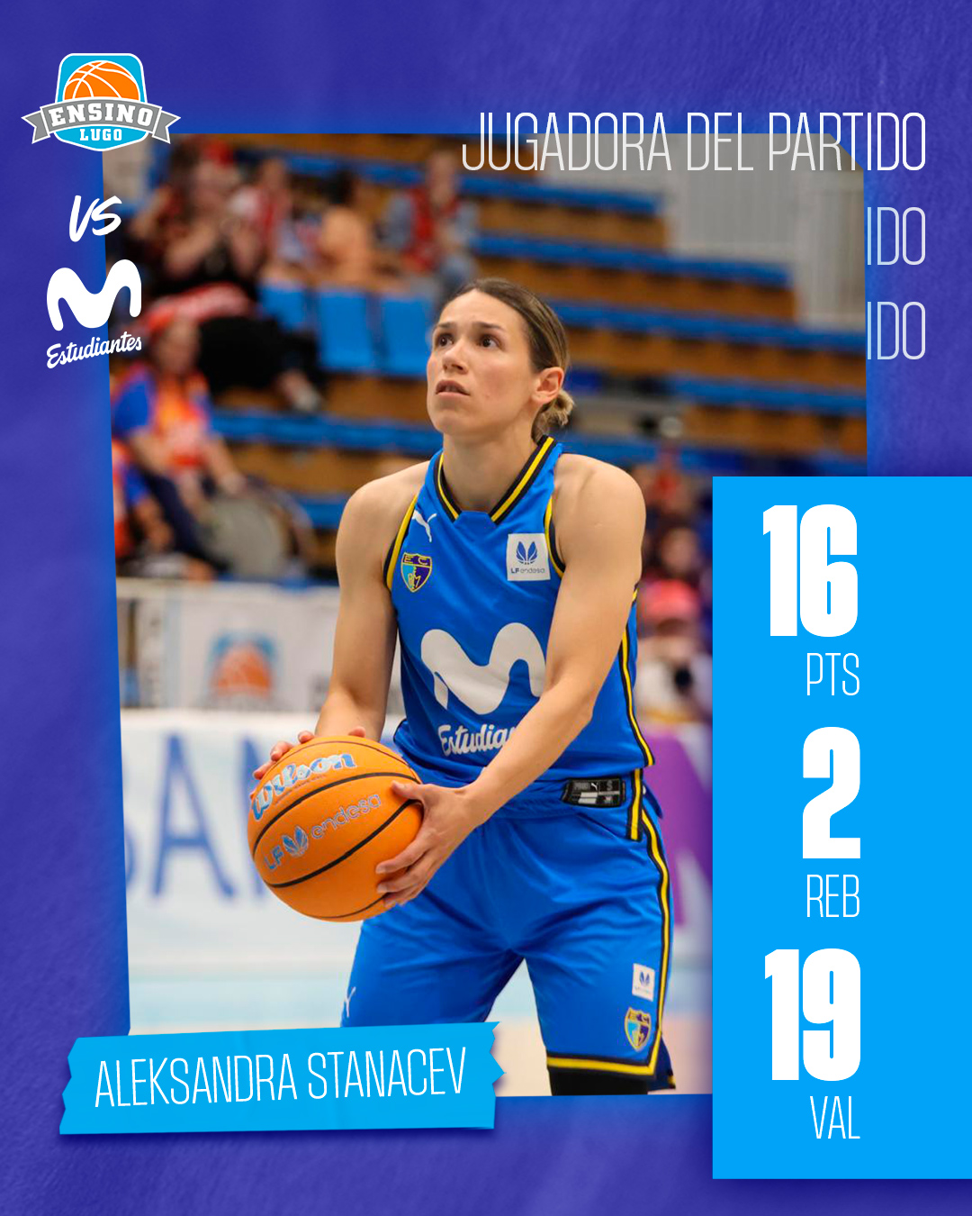 La mejor del encuentro de Movistar Estudiantes fue Aleksandra Stanacev con 16 puntos, 2 rebotes, 2 asistencias y 19 de valoración.